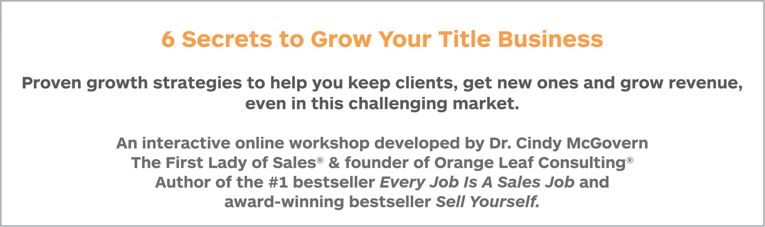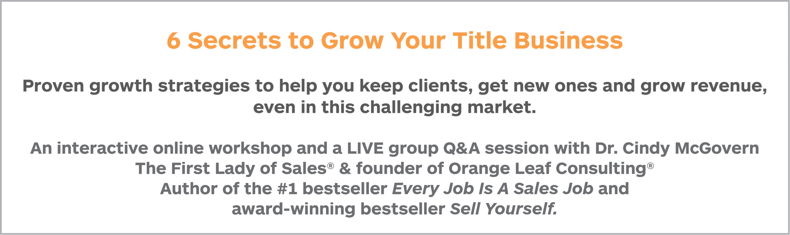 Known far and wide as the First Lady of Sales, Dr. Cindy McGovern the CEO of Orange Leaf Consulting - a firm specializing in helping the title business to grow and thrive. Dr. Cindy, as her clients call her, has earned her reputation by helping hundreds of companies and individuals to grow their businesses and achieve industry dominance.