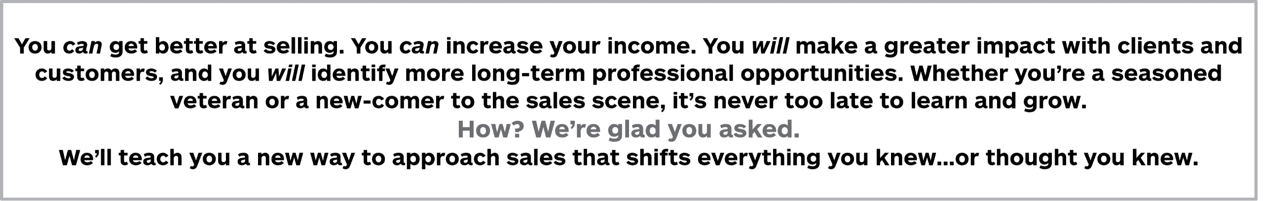 “This course is teaching me so much and a great course for someone new to sales. This program provides solid steps to a great client rapport, relationship, and close of business. I have taken so many notes and am using the steps with my prospects. Before, I would go straight in for the close of business and now I see why that wasn’t working. Thanks!”